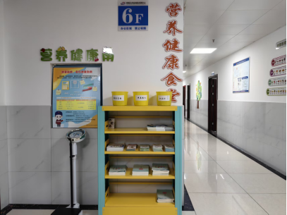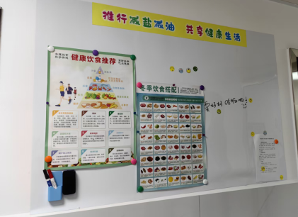 为了让健康理念深入人心,县疾控中心还精心打造了“营养健康角”,配备了身高体重称,BMI测量卷尺、电子血压计等简易检测设备,方便干部职工在就餐前后随时监测自身健康指标。同时,墙上布置了“美食心愿树”“中国居民平衡膳食宝塔”“减盐减油”等内容,留言板上张贴有可更换的营养膳食海报,让职工在排队取餐、用餐休憩的间隙,就能轻松get营养常识。